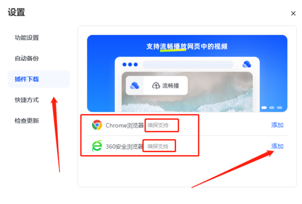 3、在这里可以看到,目前【360安全浏览器】和【Chrome浏览器】都被标作【嗅探支持】,我们下载了哪款浏览器,就在哪款浏览器选项后面点击【添加】即可。