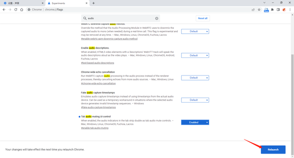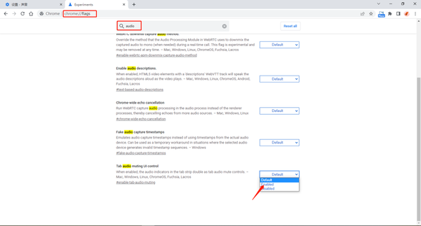 1、在地址栏输入【chrome://flags】,接着在打开的浏览器设置页面中,我们在搜索框中输入【audio】,将【Tab audio muting UI control】状态设置为【Enabled】。