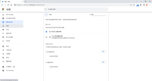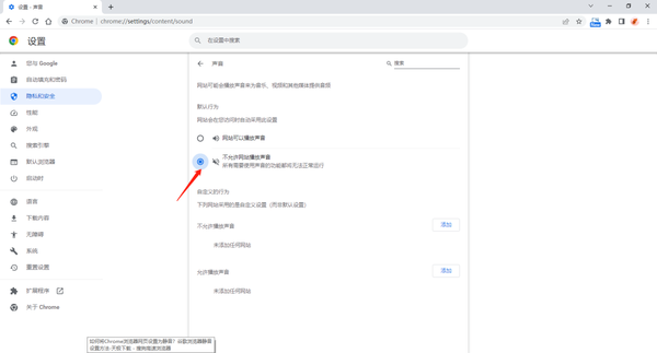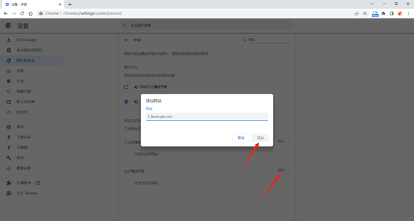 3、点击允许播放声音后面的【添加】,输入允许自动播放声音的网址,点击添加。完成以上设置后,除允许自动播放声音的网站外,其他网站打开后均为静音。