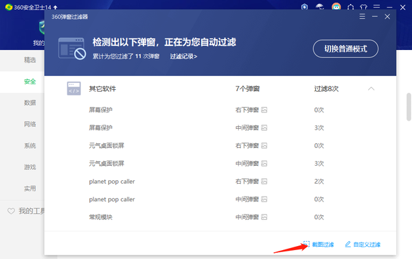 4、打开弹窗过滤界面后,360安全卫士默认开启的是选择普通模式,只能对经常出现弹窗的程序进行过滤,我们可以点击【开启强力模式】。