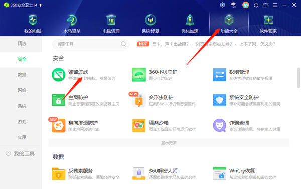 2、或者在360安全卫士主页面中点击【功能大全】,在左侧的菜单栏中选择【安全】,找到【弹窗过滤】并单击打开。
