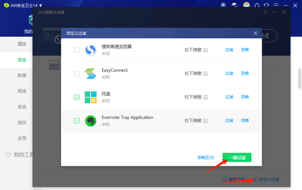 6、也可以进行【自定义过滤】,将一些经常会弹窗的程序添加过滤。勾选经常弹窗的程序,然后点击右下角的【一键过滤】按钮即可,那么只要有关于这个程序的任何广告消息弹窗,都不会显示出来。
