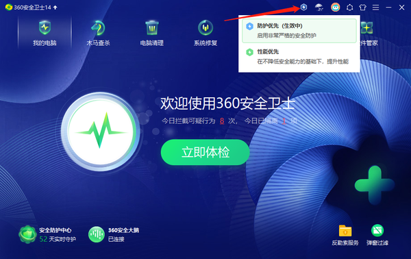 360安全卫士有两种性能模式,包括【防护优先】和【性能优先】模式。