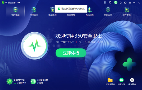 1、防护优先:这是360安全卫士默认开启的模式,在该模式下,我们可以享受非常严格的安全防护,让病毒、木马、恶意插件无懈可击!不过,该模式会影响电脑运行速度也是真的。
