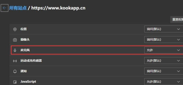 之后进入KOOK网页版的权限设置界面,找到【麦克风】,将权限改为【允许】即可。