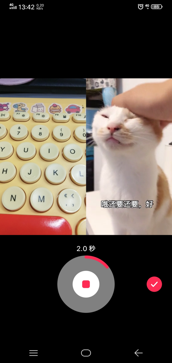 第四步,全部效果设置好以后,点击界面中间的红色【录制】按钮,然后开始合拍视频的拍摄。