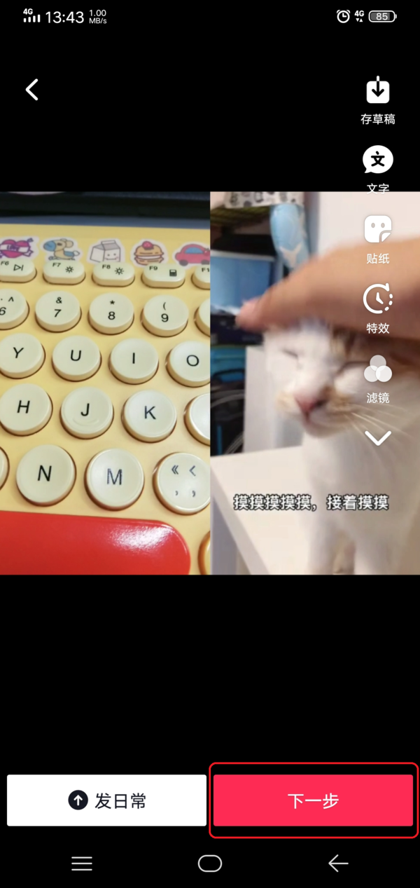第五步,视频拍摄完成后,如果对视频中的特效、滤镜等设置还是不满意的话,还可以进行修改设置,都弄好以后,点击右下角的【下一步】按钮。