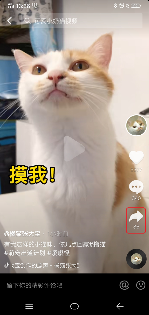 第一步,打开抖音软件,然后找到想要进行合拍的视频,接着点击视频界面右侧的【分享】按钮。