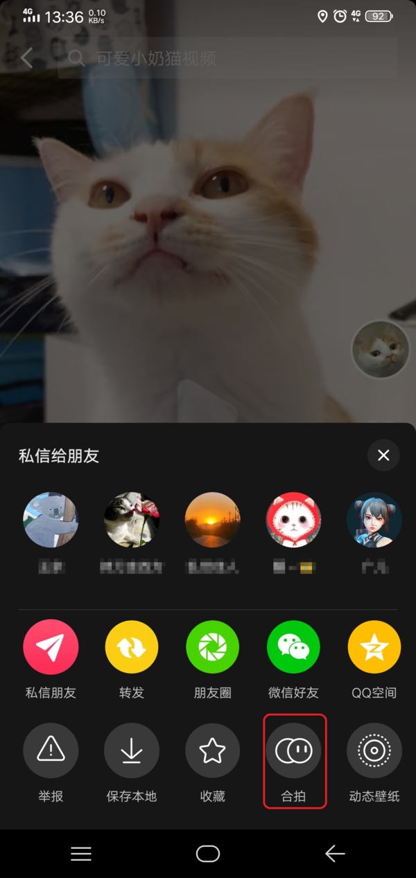 第二步,接着在弹出的选项中,找到下一排中的【合拍】功能,并点击选择它。