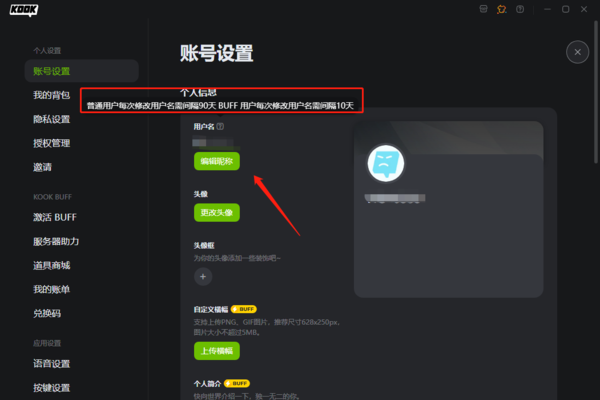 在个人资料处可以清楚地看到,【普通用户每次修改用户名需要间隔90天,BUFF用户每次修改用户名需要间隔10天】。