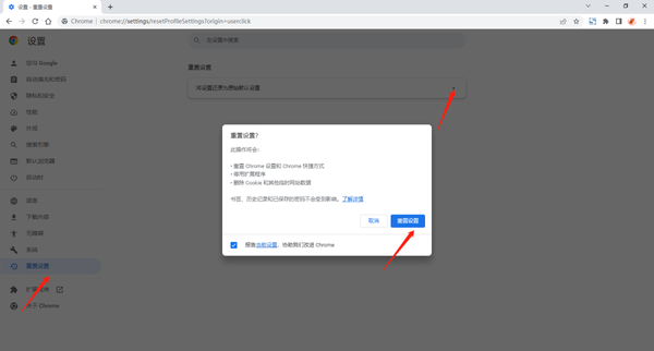 如果方法一不能解决此问题,那么可以通过重置浏览器看看,点击【重置设置】-【将设置还原为默认设置】-【重置设置】。
