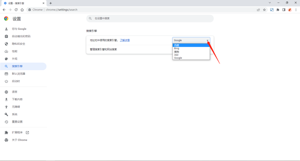 2、点击左侧【搜索引擎】,点击下拉菜单,将搜索引擎修改为百度或其他浏览器。最后关闭浏览器重新打开,就可以顺利打开网页了。