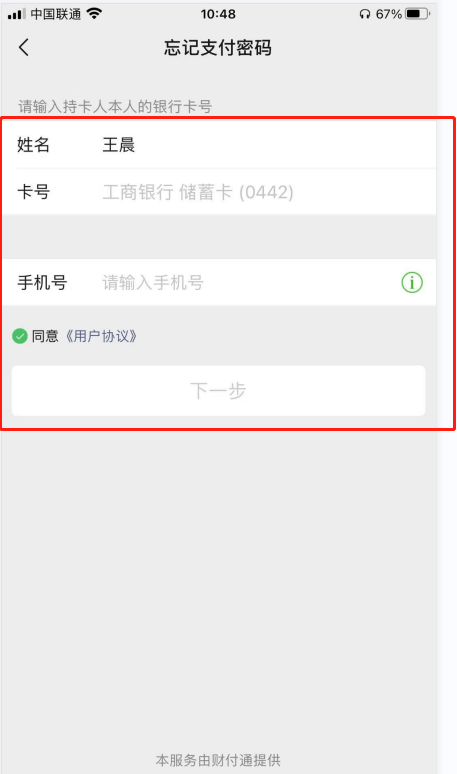 第七步:填写个人的银行卡号以及手机号,填写完点击同意(用户协议)下一步。