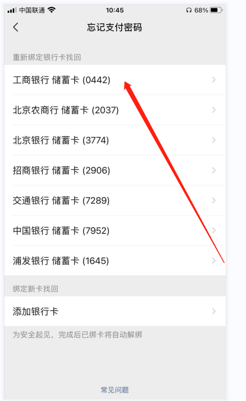 第六步:完后会进入到忘记支付密码,选择银行卡的界面,选择一张卡,方便找回密码。