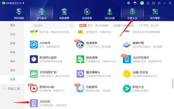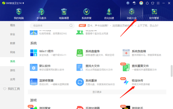 1、打开360安全卫士,点击上方菜单栏【功能大全】,在搜索框输入【极连快传】,或者在【系统】工具中找到【极连快传】。