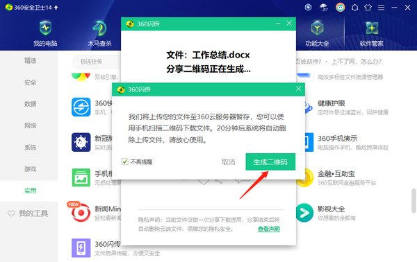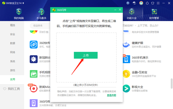 2、进入360闪传后点击【上传】,选择自己上传的文件。