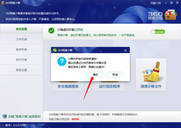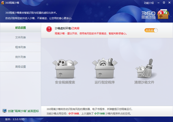 360隔离沙箱是360安全卫士中的一个功能,集合智能识别与轻量的虚拟化技术,自动识别有风险软件进入沙箱,提供安全的隔离运行的空间,不用担心电脑会中毒。利用虚拟化技术在磁盘中建立一个与系统隔离的独立空间,一些安全性不明的视频播放网址和程序可以在沙箱中运行以提高系统的安全性。