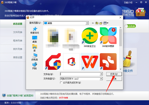 3、这时候会跳转到程序打开选项,选中我们觉得有风险的程序,然后点击【打开】,即可在沙箱内运行。
