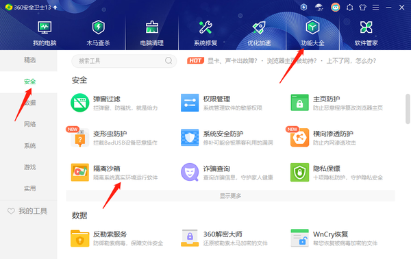 1、打开360安全卫士,点击上方【功能大全】,在左侧选择【安全】,然后在右边找到【隔离沙箱】并打开。