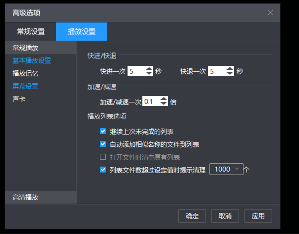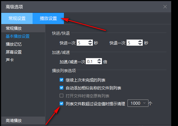 3、此时进入到高级选项后,切换到“播放设置”标签页,在这个页面中有快进、快退、加速、减速、播放列表选项等功能,找到最后一个播放列表选项,在这个区域下方有四个功能,只需要在“播放列表”选项里把最后一个功能勾选上,这个功能是“列表文件数超过设定值时提示清理”。