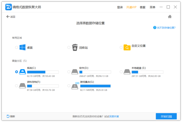 万兴恢复专家提供了多种类型的恢复功能,并根据不同的种类和位置进行了划分,首页是选择路径界面,选择需要扫描的位置后,点击开始就会进行文件扫描。