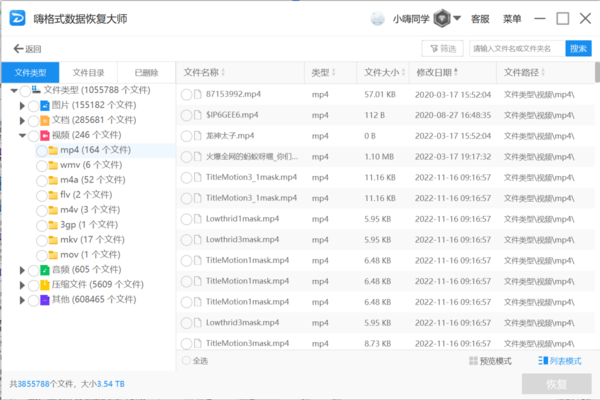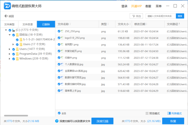 嗨格式数据恢复大师:我们可以根据【文件类型】【文件目录】和【已删除】中找我们删除的数据,我这里是在【已删除】里查找的文件,找回了所有删除的文件。