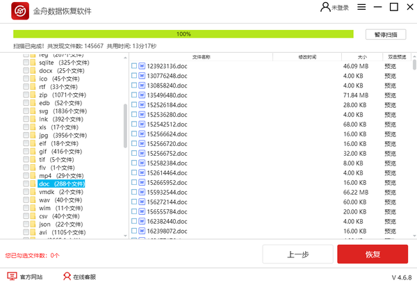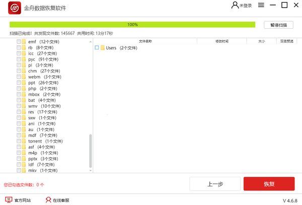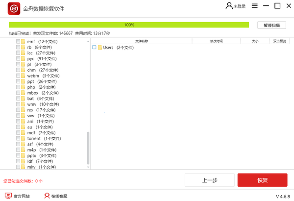 金舟数据恢复:扫描结束后也是可以直接根据列表查找删除的文件,跟上面的软件情况差不多,需要耗费时间仔细查找扫描出来的文件,耗时久。