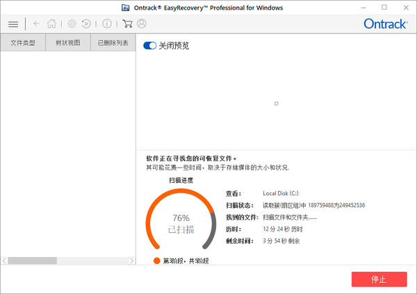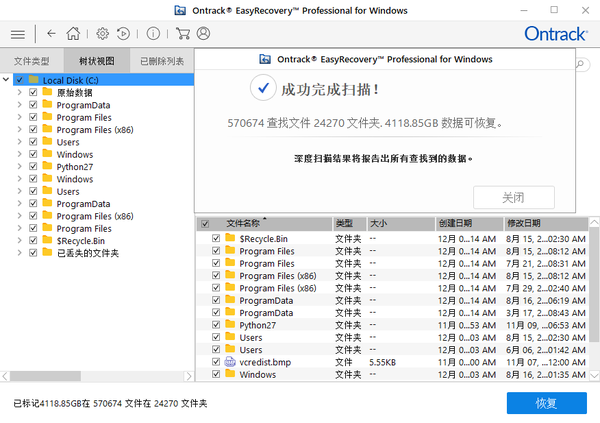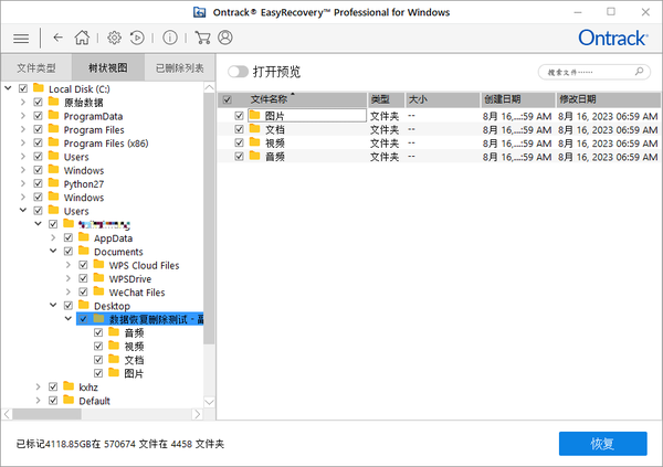 EasyRecovery:软件扫描结束后,我们可以在【文件类型】【树状视图】【已删除列表】这三个分类查找文件,经过尝试发现,根据【树状视图】这个分类查找比较节省时间。