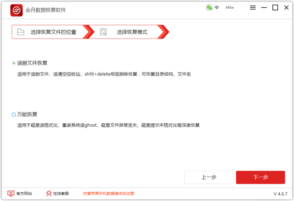 金舟数据恢复软件的首页是选择恢复文件的位置界面,确认需要扫描的硬盘后点击下一步,选择需要使用的恢复模式就可以开始扫描。