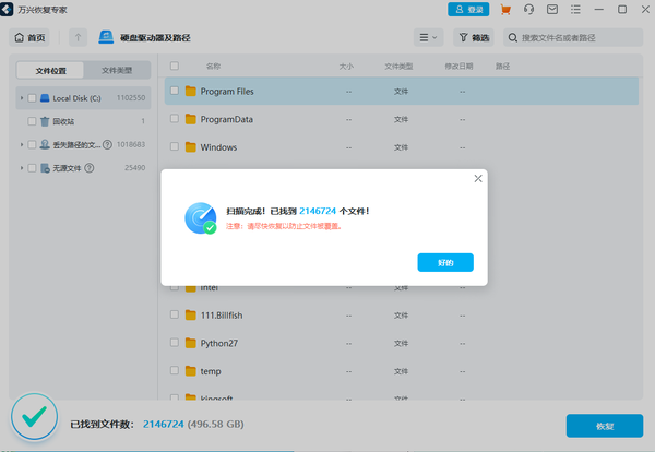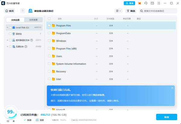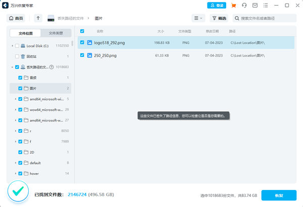 万兴:软件扫描结束后,我们可以在【文件位置】【文件类型】这两个分类,查找我们删除的文件。虽然万兴扫描出来的数据很多,但扫描出来的我们想要恢复的数据却是不多。