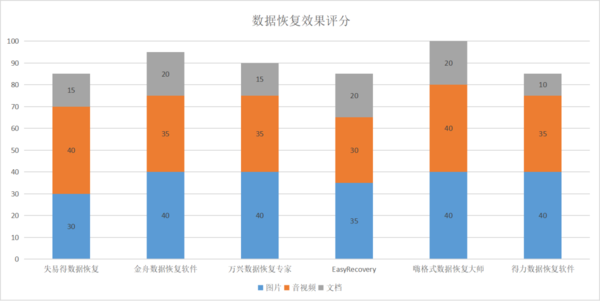 在实际的恢复测试中,我们选择了图片、视频、音频和office文档几类常用文件进行测试,测试的文件总量为200个,其中图片和音视频的文件数量各占40%,office文档数量占20%,根据实际的恢复情况公布评测结果,详情见下图。