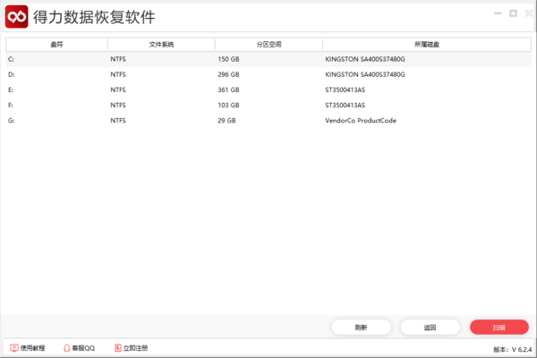 得力数据恢复首页是功能选择界面,用户根据实际需求选择被删除文件的方式后,点击开始恢复进入到路径选择界面,选择需要扫描的硬盘后即可开始扫描。