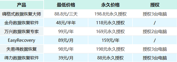 参与测试的6款数据恢复软件均提供会员增值服务,需要购买授权后才能导出恢复文件,软件价格从39元到198.8元不等,主要差距在于会员时间及电脑台数。