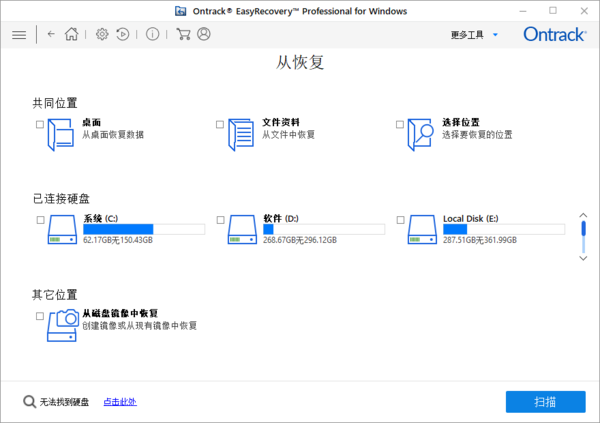 EasyRecovery的首页是选择恢复内容界面,勾选需要扫描的文件类型后,点击下一步进入到路径选择页面,选择扫描位置后就可以开始扫描。