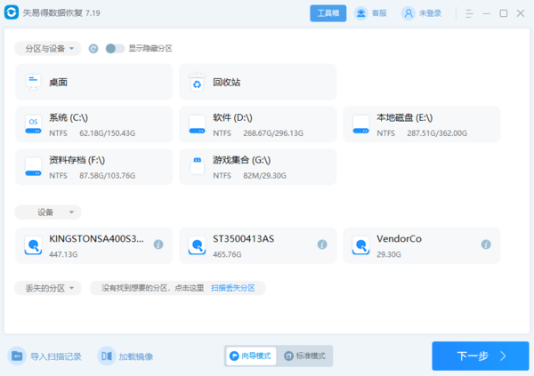 失易得数据恢复的首页分为向导模式和标准模式,根据不同用户的需求对功能进行了划分,直接点击就能进入到相应的功能界面中。在路径选择页面选择需要扫描的硬盘或设备,点击下一步选择文件类型后就可以开始扫描。