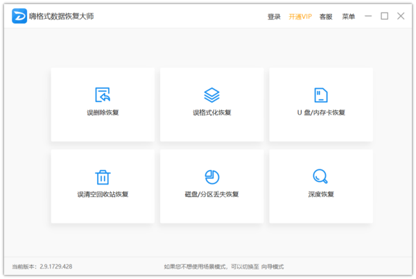 嗨格式数据恢复大师提供了场景模式和向导模式两种选择,用户可以根据自身需求在两种模式间切换。确定需要使用的功能后,直接点击就能进入到相应的功能界面中。在路径选择页面选择需要扫描的硬盘,即可开始扫描。