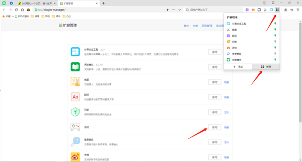 3、禁用不必要的扩展程序:有些扩展程序可能会导致浏览器占用过多的CPU资源,因此可以禁用一些不必要的扩展程序,点击右上角四个方块的图标,选择【管理】进入扩展管理界面,将不常用的停用掉即可。