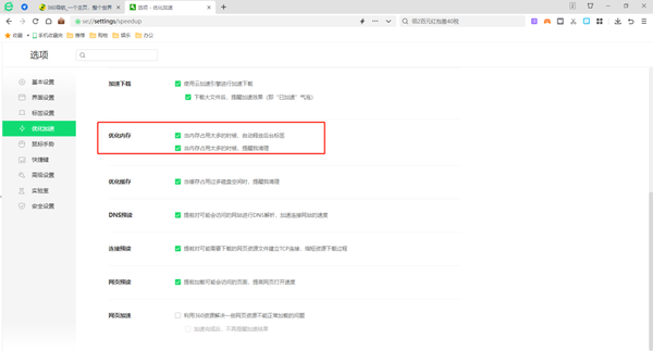 5、关掉360安全浏览器的优化加速和广告推送等:进入到360安全浏览器设置界面后,选择右侧的【优化加速】,取消勾选【优化内存】,不要让浏览器不停地检测电脑,节省资源开销。以及关闭实验室界面中的【智能助手】,节省CPU资源的开销。