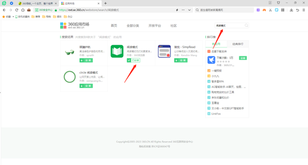 2、在360应用市场界面的搜索框中输入【阅读模式】,然后点击【安装】。