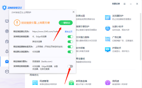 3、进入2345安全卫士上网防护界面后,点击【一键锁定】,或者直接开启最下方的【支持锁定的浏览器】即可快速开启上网防护,轻松锁定浏览器和主页。