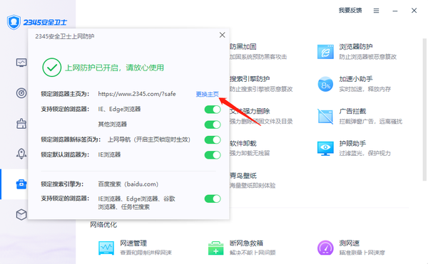 4、当然我们也可以按需设置浏览器的默认主页,点击【更换主页】然后输入主页网,这样我们浏览器的主页就被2345安全卫士锁定了,其他软件就无法篡改浏览器的主页了。。