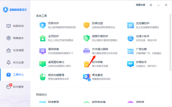 我们在使用电脑时,经常会安装和卸载软件,有些软件在卸载完成后依然有部分文件保留在硬盘中,手动删除又无法去除干净,这时候我们可以借助2345安全卫士来进行强力删除,不过还是有朋友不清楚2345安全卫士文件强力删除功能在哪,以及强力删除的文件还能不能恢复呢,接下来就为大家介绍一下2345安全卫士强力删除文件的方法。
