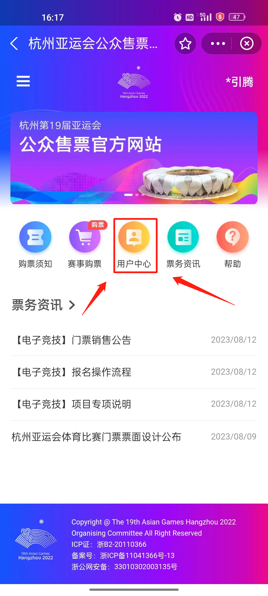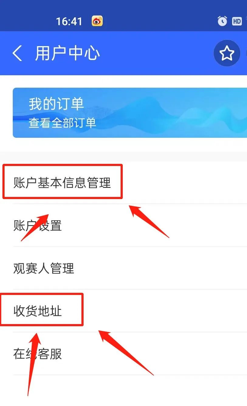 3.完成注册后,回到票务通的主页面,点击【用户中心】,填写观赛人信息和地址,提前填好信息抢票快人一步!