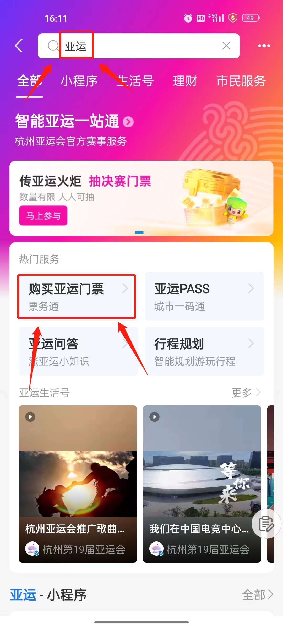 1. 上支付宝搜【亚运】,在智能亚运—站通小程序购票