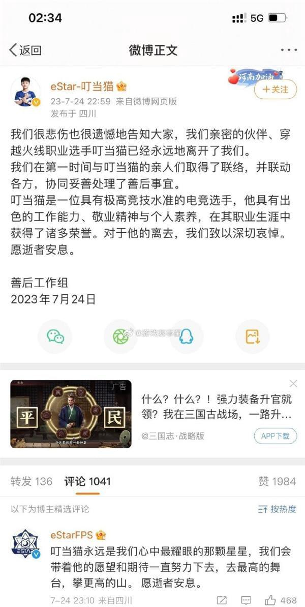 7月24日晚,工作组发表声明:CF的职业选手eStar叮当猫去世。