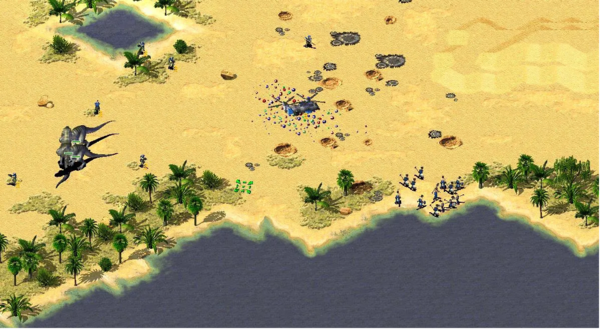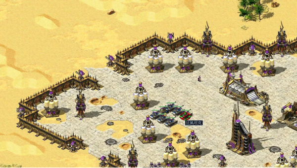 3,在埃及金圣塔的地图左上方找到方形的水洼,然后指挥几个士兵过去勾引步兵车和狙击手,再派三个小兵站到草皮上面,就能够召唤出三个暴龙帮助我们作战。