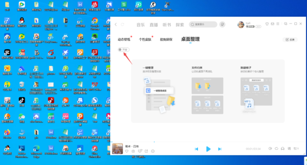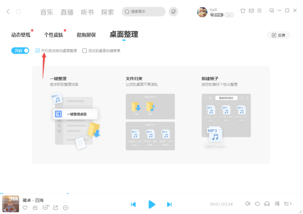 还是根据上述的步骤方法,进入到酷狗音乐的桌面整理界面中,在开启了它的桌面整理功能后,大家在开关的右侧可以看到一个【开机自动启动桌面整理】的功能,将此功能进行勾选,即可实现酷狗音乐开机自动整理电脑桌面图标的需求了。