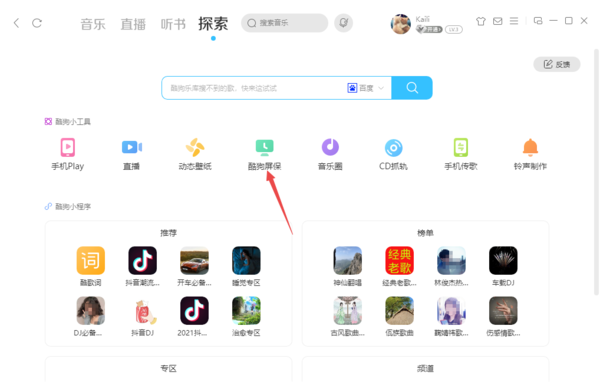 第二步,在探索界面中,找到【酷狗屏保】小工具,点击它。