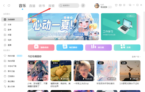 第一步,启动电脑端的酷狗音乐软件,然后点击界面顶部的【探索】选项。
