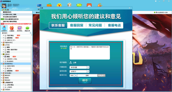 2、进入反馈界面后将遇到的问题输入进【具体描述】一栏中,点击【提交】,就可以等待客服的回复了。也可以在【客服QQ】板块中,复制并添加客服QQ进行线上咨询。